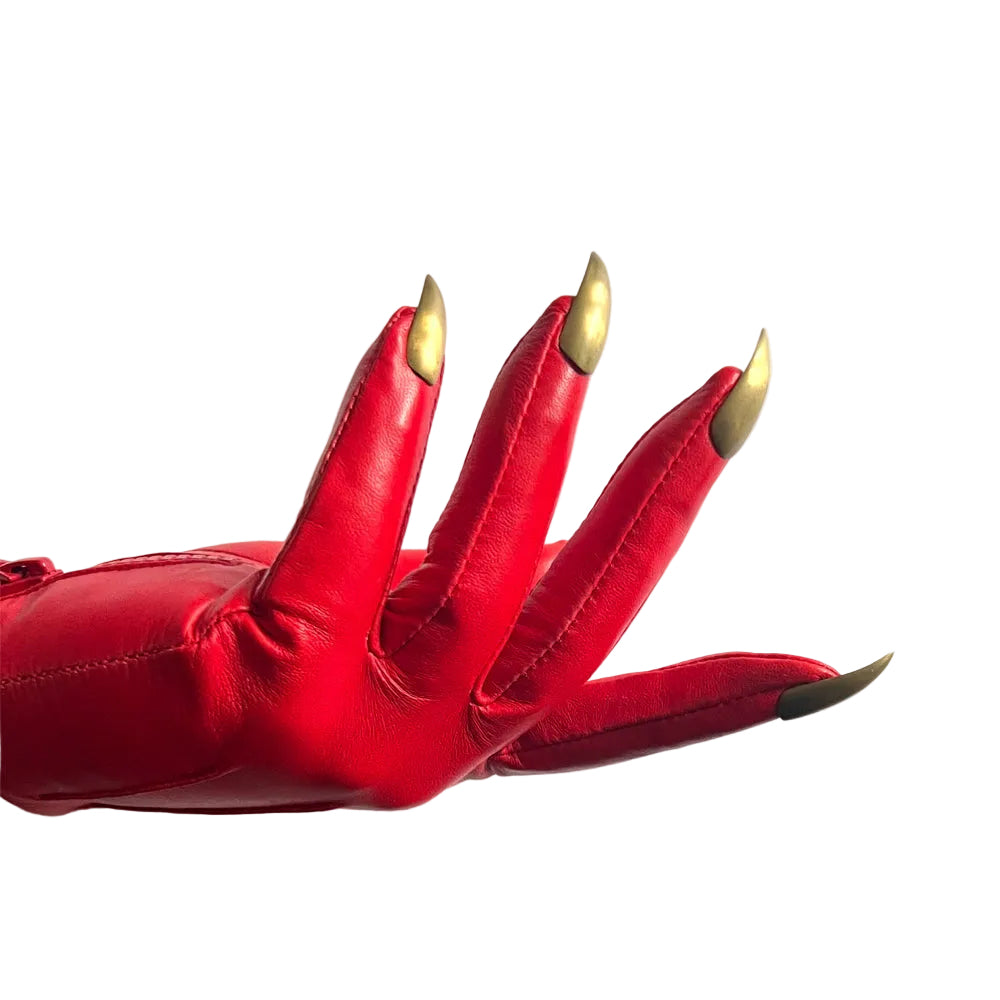 These red leather vamp nail gloves have brushed brass hardware with some oxidization making the nails look more antiqued and interesting. They are new and feature a zipper we don't regularly use, a red closed end zipper vs a red invisible zipper.
